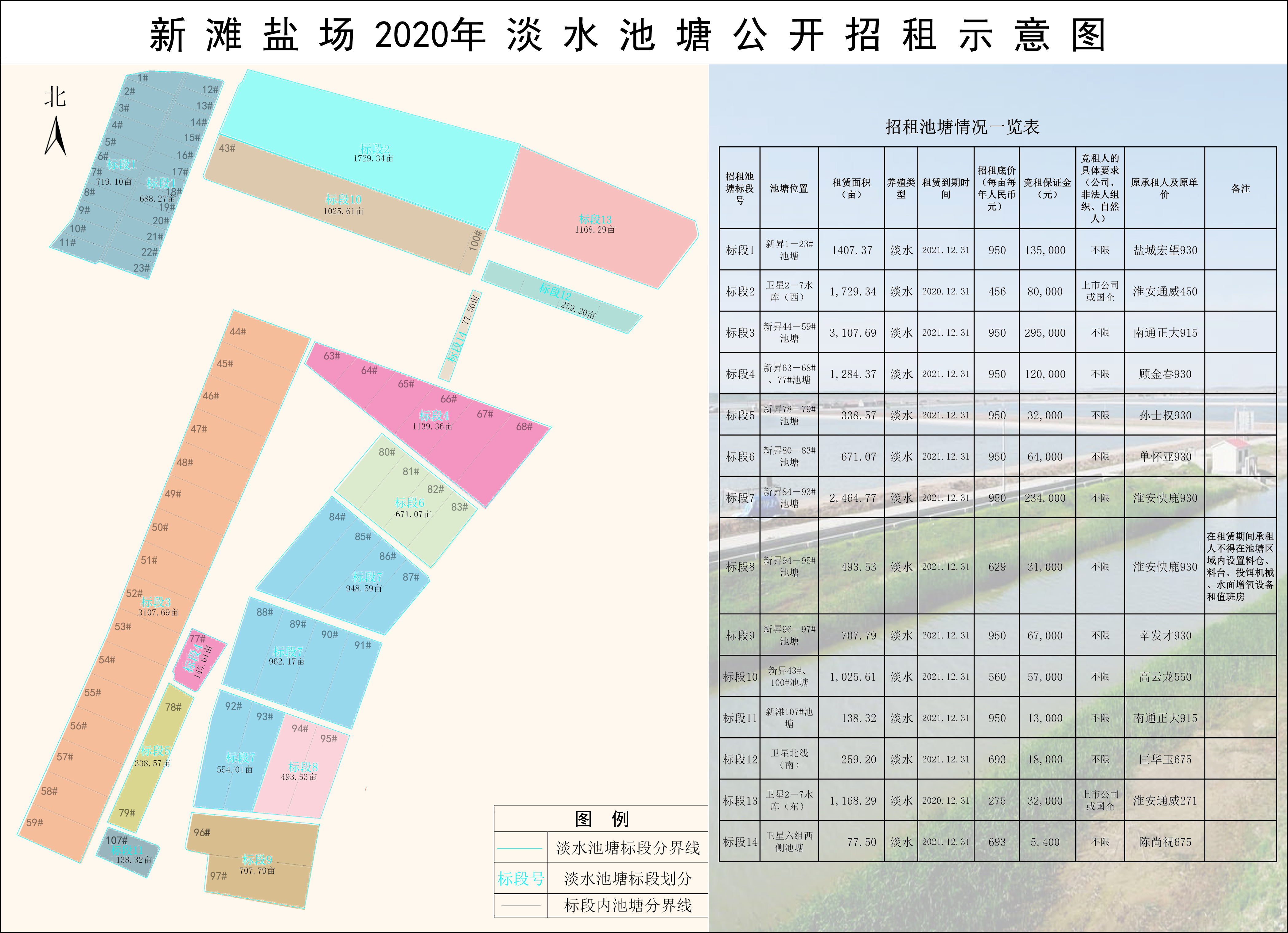 2.實(shí)行“一塘一價(jià)”,競(jìng)租人按照《招租池塘情況一覽表》中各個(gè)標(biāo)段號(hào)的招租池塘的招租底價(jià)、租賃期限、競(jìng)租保證金數(shù)額和對(duì)競(jìng)租人條件的具體要求等情況進(jìn)行報(bào)名競(jìng)租。